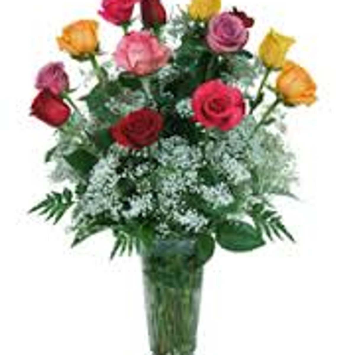 A dozen mixed roses in a clear glass vase — the shop favorite for anniversaries and thank-yous.